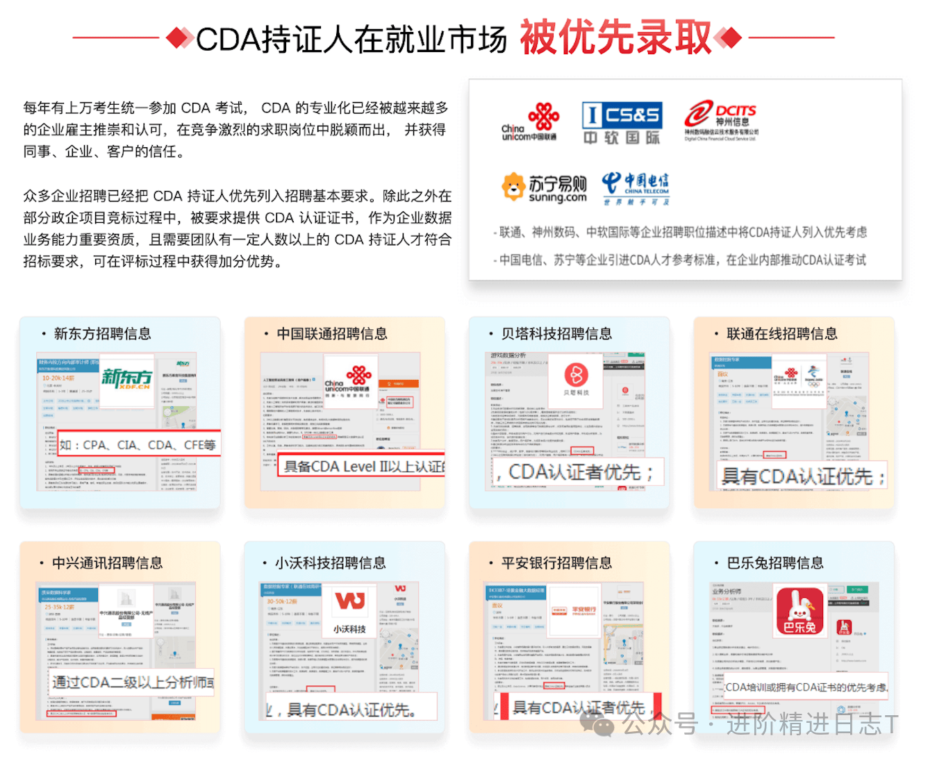 ✅CDA企业承认度若何?CDA企业承认度很是高,良多企业聘请时说明CDA数据阐发师优先,良多银行、金融机构的手艺岗会要求必需是CDA数据阐发师二级以上的持证人。中国联通、央视广信、德勤、苏宁等企业,把CDA持证人列入优先考虑或者对员工的CDA测验给补助。